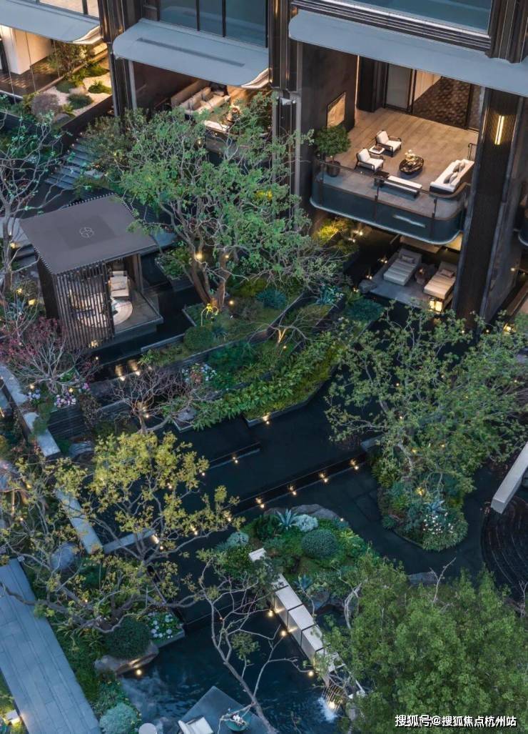自【悬浮茶室】拾级而上,在【思韵书院】外,一处闲憩放空的【阅川水岸】至此呈现,脚下溪流自脚下蜿蜒而过;眼前,是 幻影蓝奢石池底 的幽邃微光。一株来自地 中海的油橄榄 ,与 一棵百年老桩紫薇 在此相望。
