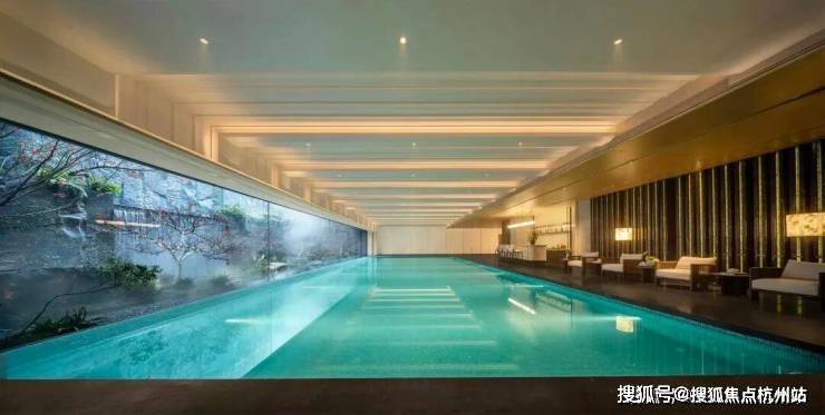 古驰黑奢石与非遗琉璃共筑的背景墙 ,映照着窗外由 天然岩皮与奢石砌成的三级瀑布 。羽毛枫在岸边隔窗静立,泳池全地暖设计,恒温脉冲水流轻抚肌肤,并于岸边打造 镜湖春晓奢石 、 搭配贝壳艺术背景墙设计的酒店式水吧台休憩区 ,布置全套 安缦御用的HARBOUR户外家居 。 【溪谷泳池】 游弋其中,是一次对自然与艺术的全身心沉浸