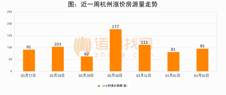 根据诸葛找房数据显示,杭州24小时涨价房源量为95套,较04月01日增加14套,环比上涨17.3%。与此同时,涨价房源占比小幅扩大,业主信心有所提升。