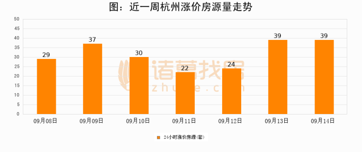 根据诸葛找房数据显示,杭州24小时涨价房源量为39套,较09月13日持平。