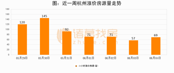 根据诸葛找房数据显示,杭州24小时涨价房源量为69套,较06月03日增加12套,环比上涨21.1%。与此同时,涨价房源占比小幅扩大,业主信心有所提升。