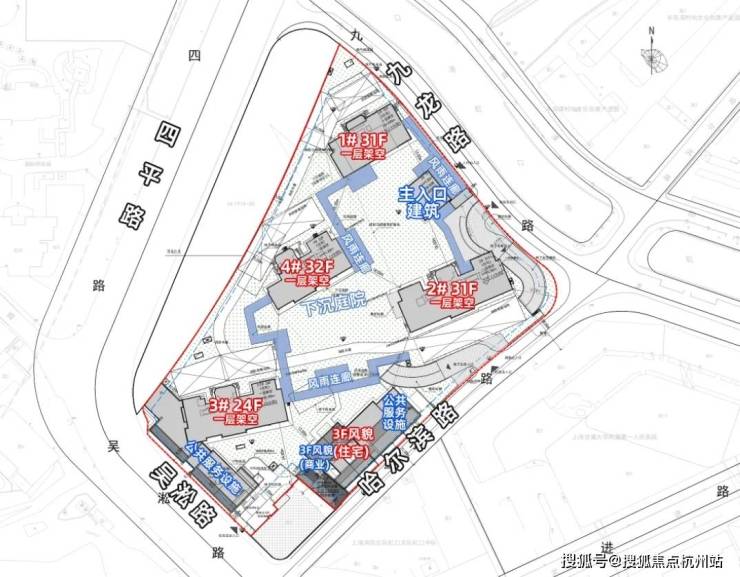 4栋住宅一层全部为架空,入口至楼栋间设置有风雨连廊。