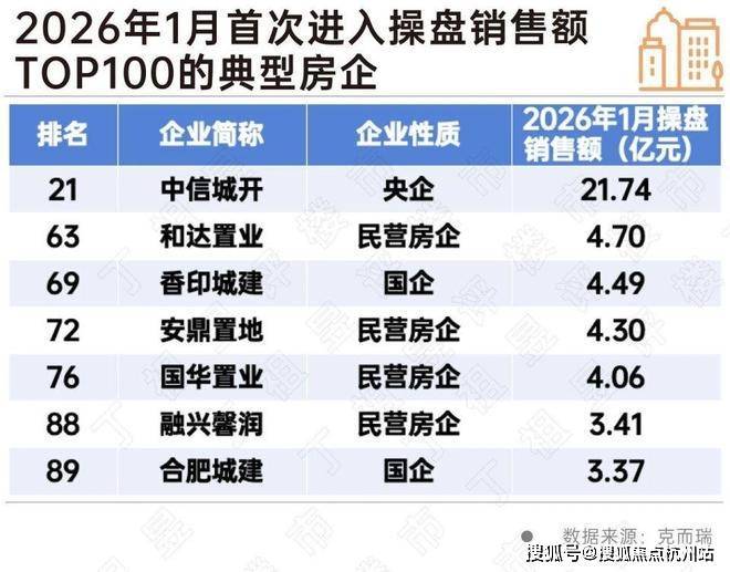 值得注意的是,2026年1月共有7家企业首次进入了TOP100榜单,其中中信城开甚至直接闯进了TOP30。整体来看,这7家房企中有4家是中小民营房企,在市场筑底的背景下部分房企经营仍然较为平稳,实现了逆势爬升。