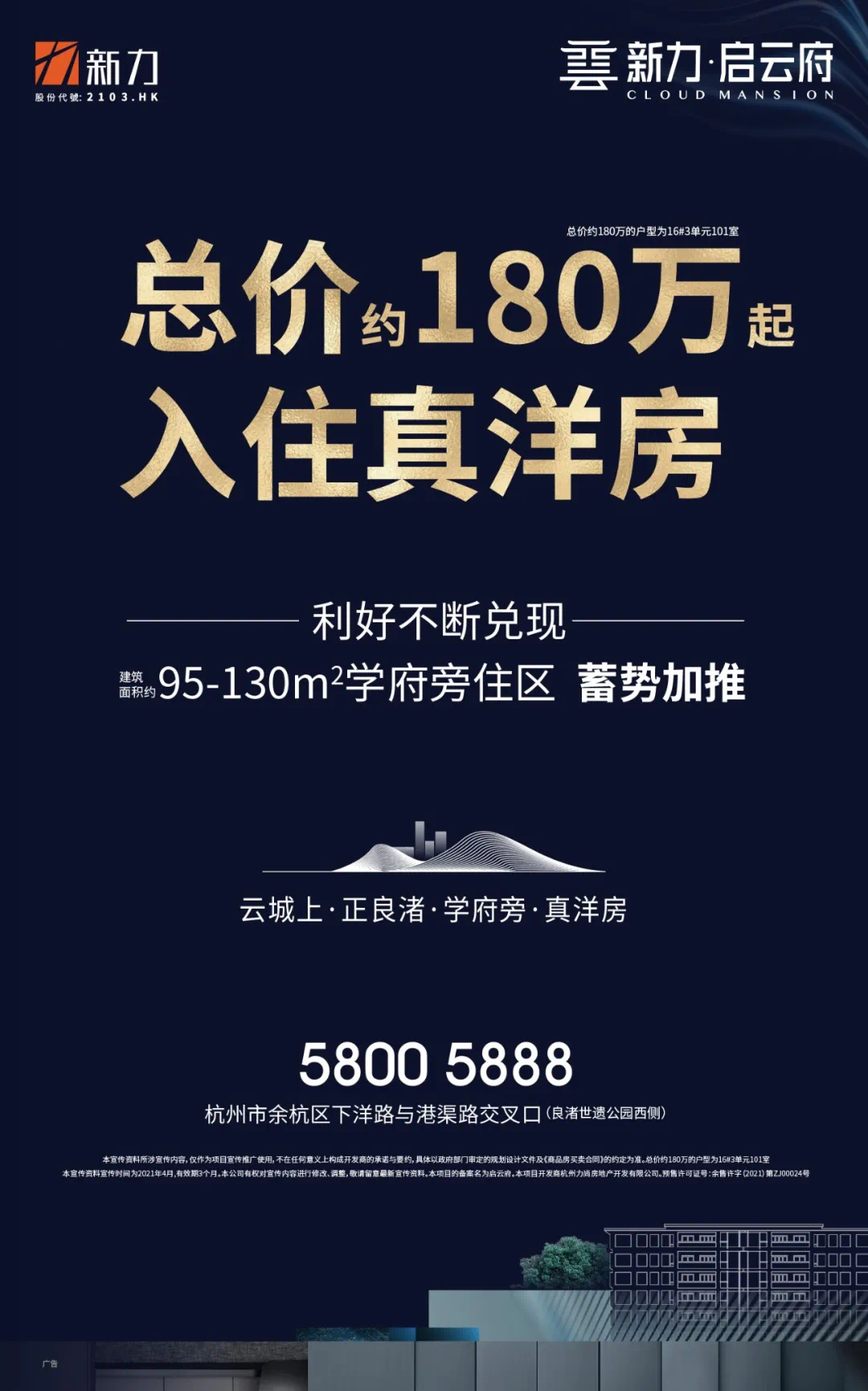 本广告为要约邀请,所示图片及文字仅供形象宣传之用,不构成合同内容,买卖双方的权利义务以双方签订的《商品房买卖合同》及其补充协议、附件等书面文件和政府最终审批为准。新力• 启云府项目,核准地名启云府。本广告相关内容信息不排除因政府相关规划、规定及出卖人分期规划、未能控制等原因而发生变化。本广告所提及的学校仅旨在告知相关内容,并不表示我司对此提供保证,不作为合同内容或要约。未来学校的名称、办学性质、办学规模、学位设置、开学时间、招生条件、收费标准及招生区域等存在调整的可能,具体须以政府教育主管部门以及学校的较新政策为准。总价约180万的户型为1#1单元102室。本广告所涉及的文字、图片仅供参考,如有不适合内容刊载,请及时联系我司处理。本广告发布时间为2021年4月,有效期为3个月,出卖人将不定期对宣传材料进行修改,敬请留意较新资料。开发商:杭州力尚房地产开发有限公司。预售许可证号:余售许字(2021)第ZJ00372号。