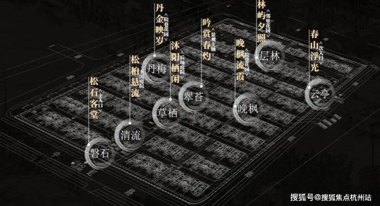 8大景观节点:营造可行、可观、可游、可居的东方诗意天地。①松石客堂-主入口;②松桕悬流-下沉庭院;③沐阳栖闲-后场庭院;④吟赏春灼-景观主轴;⑤丹金映岁-院巷花园;⑥晚枫流霞-院巷花园;⑦林屿夕照-邻里花园;⑧春山浮光-次入口