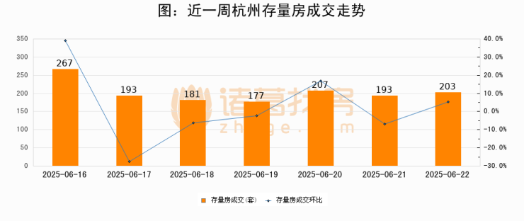 从存量房来看,2025年06月22日杭州存量房单日成交203套,比昨日增加10套,环比上涨5.2%。从近一周存量房成交来看,杭州存量房日均成交套数为203套,06月22日单日成交203套,与近一周平均水平持平。