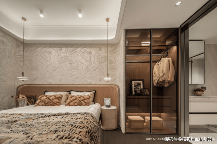 主卧延续了客厅的定制弧形设计+石膏装饰线角+天花四边灯,提升主卧品质感和美学效果。飘窗为大理石台面,不仅让室内有更多的灵动空间,更提升了品质效果。