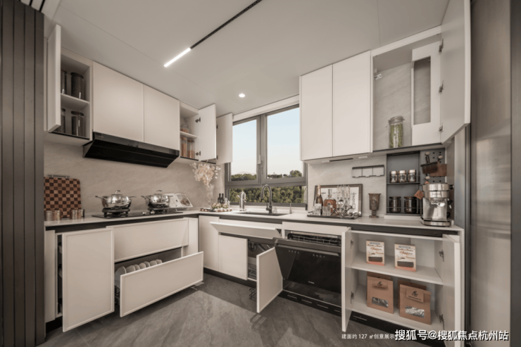 柏厨(或同等档次品牌)的定制柜体,整体橱柜哑光吸塑延续造型翻边设计,很好的提升空间流线感。厨房电器配置了方太(或同等品牌系列)三件套(抽烟机、燃气灶和洗碗机)。洗碗机配置了12套容量大小,洗排烘消存(洗碗、排水、烘干、消毒、存储)一体,完全可以满足5人以上家庭成员的餐具清洗。
