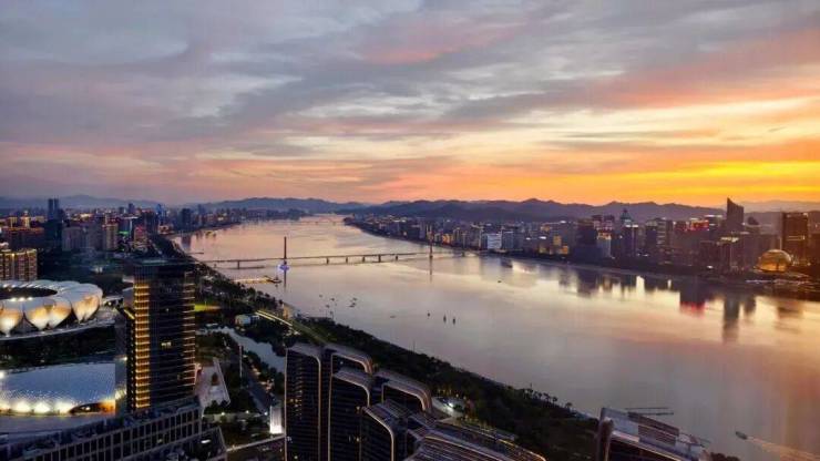 钱塘江如一条金色的丝带蜿蜒流淌,与远处的法国塞纳河遥相呼应,虽相隔万里,却在这一刻形成了美妙的对话。IOC的设计灵感来源于钱塘江的壮阔江潮及其周边丰富的城市肌理,“日出江花”与“春来江水”的主题立面对应着四季变换的自然景观,不仅赋予了建筑以生命力,也让每一位驻足于此的人们感受到时间的流转与生命的律动。