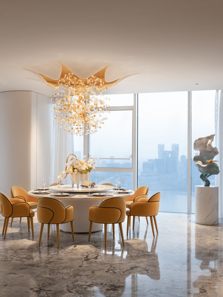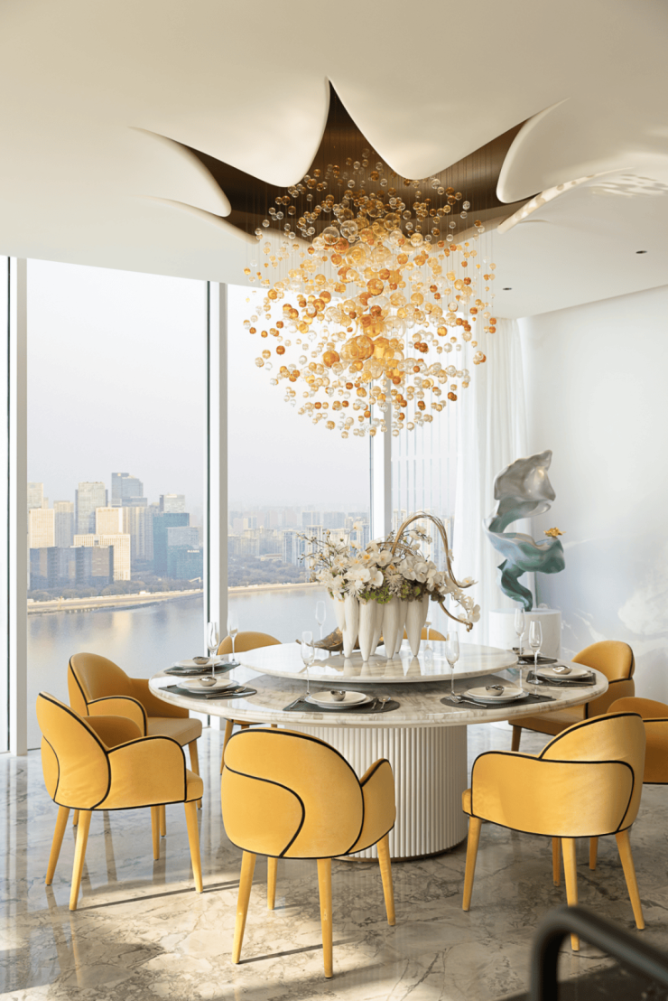进入玄关,眼前豁然开朗。对于平层宅邸而言,视野便是一切。客餐厅的最大亮点,是一片大面落地窗外的自然江景,天地间最温柔的馈赠。设计师巧妙地解放了空间,打破了所有动线的束缚,把奢华豪邸应有的华贵气度,毫不保留地归还于每一个细节。