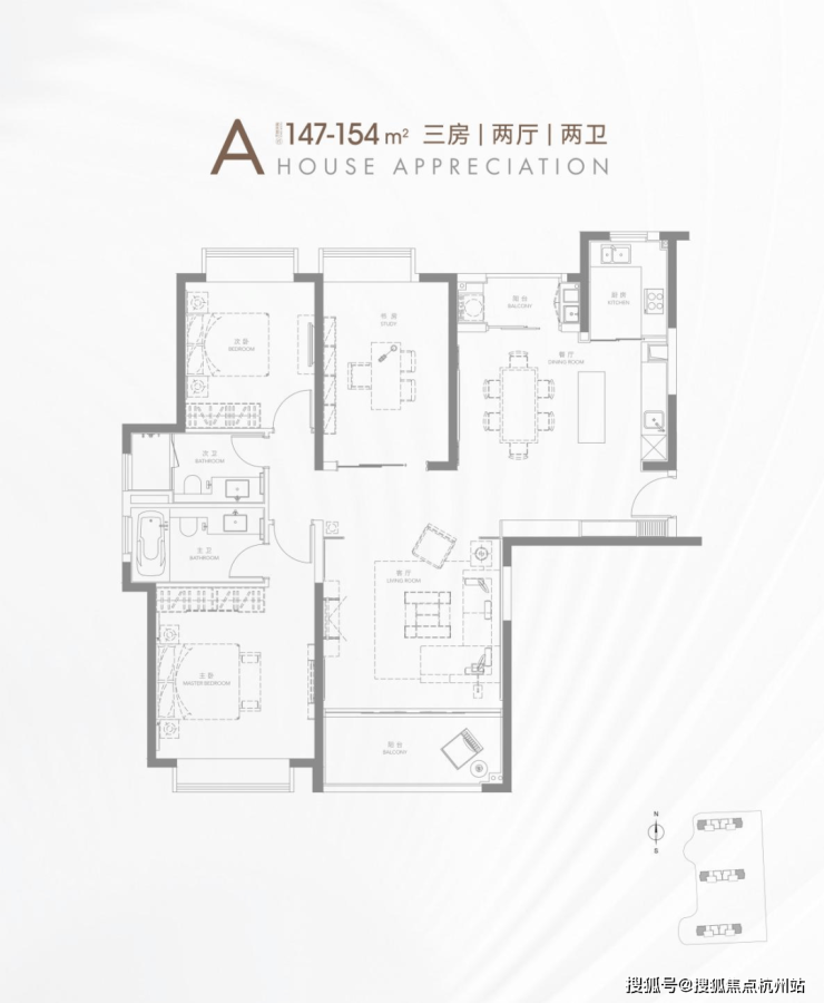 高层得房率近80%,154㎡3 房客厅面宽 4.5 米,LDK 一体化,主卧套房 + 飘窗