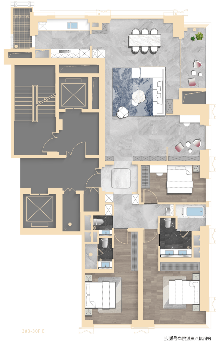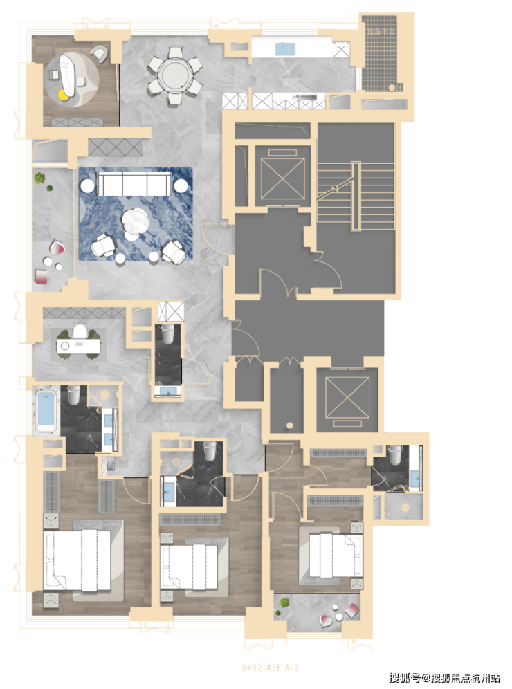 165 米云端大平层:3 栋 ARTDECO 地标建筑(最高 165 米),香槟金铝板 + 玻璃幕墙,建面约 195-408㎡,3-5 房奢阔户型,270° 环幕落地窗,得房率约 81%。