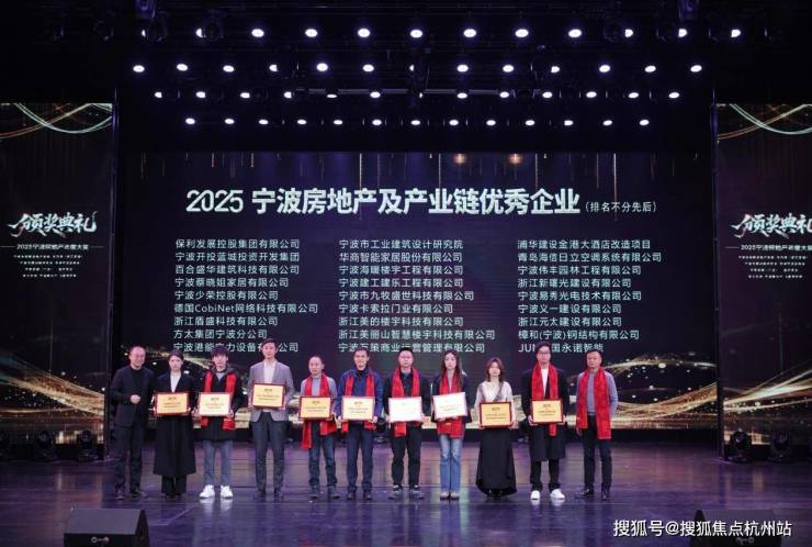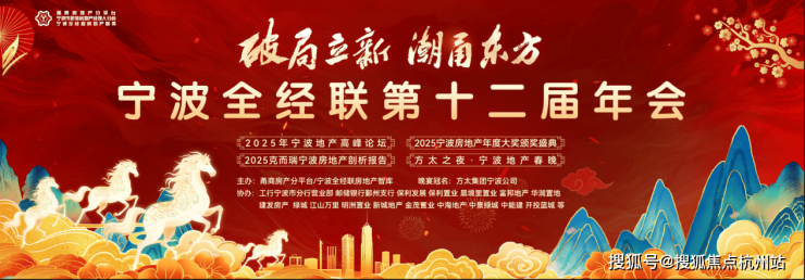 宁波全经联房地产智库第十二届年会暨 2025 宁波房地产年度高峰论坛 &“方太之夜” 宁波地产春晚于 2026 年 1 月 24 日盛大启幕。本次盛会由宁波全经联房地产智库主办,方太集团宁波公司独家冠名晚会,工行宁波市分行营业部、邮储银行鄞州支行、保利发展、保利置业、晨境里开发、富邦地产、华润置地、建发房产、绿城、江山万里、明洲置业、新城地产、金茂置业、中海地产、中景绿城、中能建、开投蓝城、缅甸浙商工业园等众多企业协办,采用线下相聚与线上直播同步的形式,吸引了房地产及产业链负责人、投资及金融专家、艺术家、媒体人士及各商协会负责人等各界精英共 350 余位嘉宾齐聚一堂,共探行业破局之路,共话发展新机遇。作为宁波房地产行业的年度盛会,极具权威与公信力的 “2025 宁波房地产年度大奖” 也在现场隆重揭晓,成为行业关注的焦点。