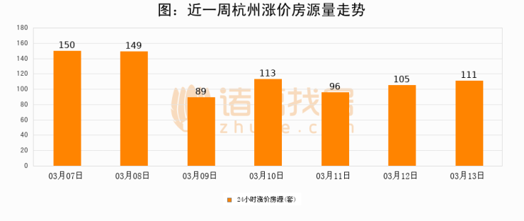 根据诸葛找房数据显示,杭州24小时涨价房源量为111套,较03月12日增加6套,环比上涨5.7%。与此同时,涨价房源占比小幅扩大,业主信心有所提升。