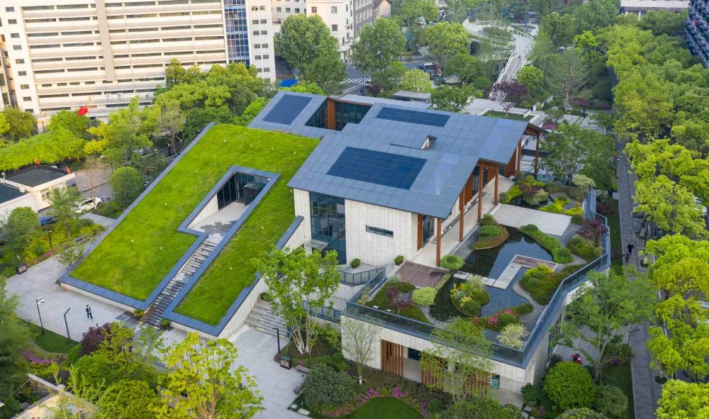 临平图书馆建筑设计结合趣石、竹木、山水、庭院的四大元素,复折屋顶的设计犹如群山,露台则是结合了叠水的意向,刻画出中国传统书画中山水的意境。而最东侧的折屋顶,通过整个植草屋顶的设计,体现了建筑的科技型以及绿色生态的理念。