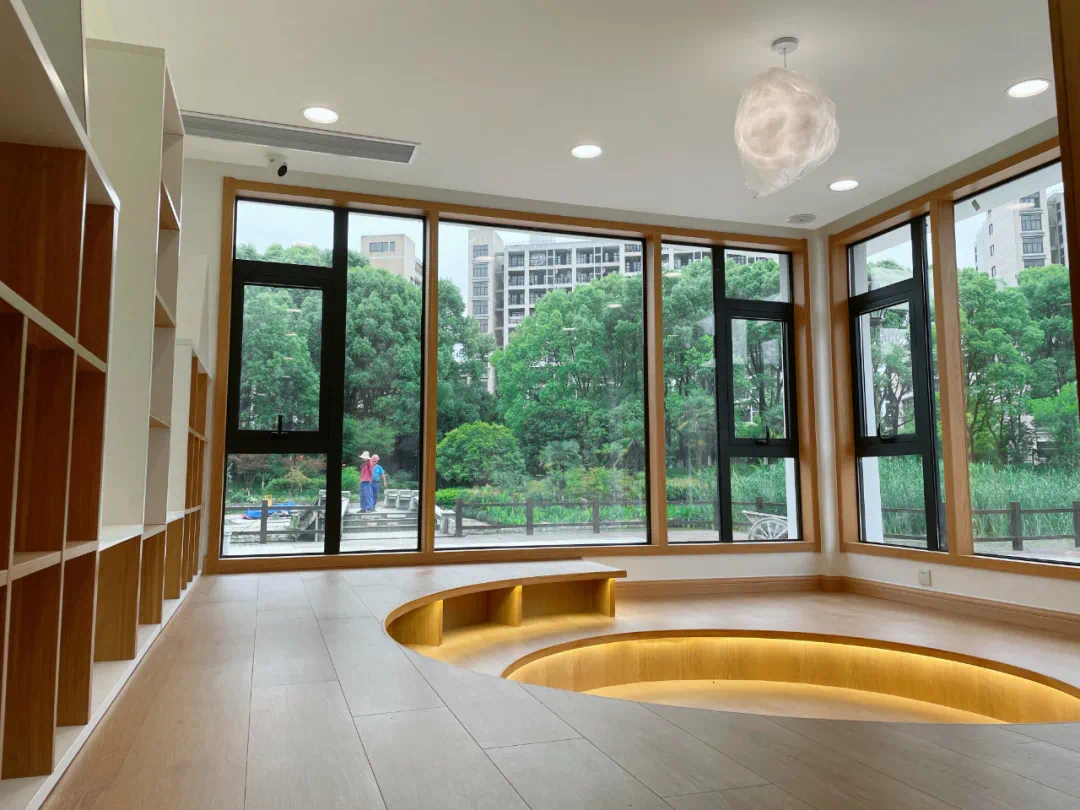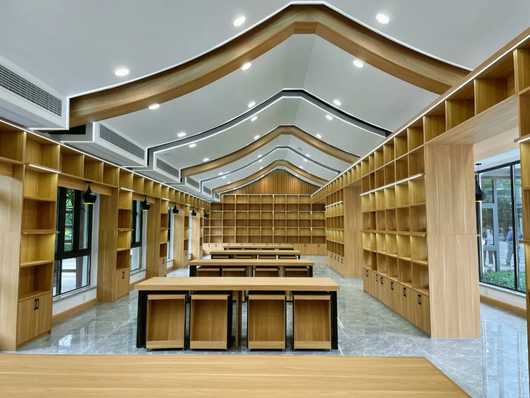 走进书房,宽敞舒适的阅读空间、耸入屋顶的木质书架、明亮通透的落地窗、独具特色的弧型座椅……书房面积约500平方米,坐在任何位置,都能享受到这股自然之韵。遨游在书海里,伴随着花香与鸟鸣,感受沉浸感的阅读体验,优质而宁静。