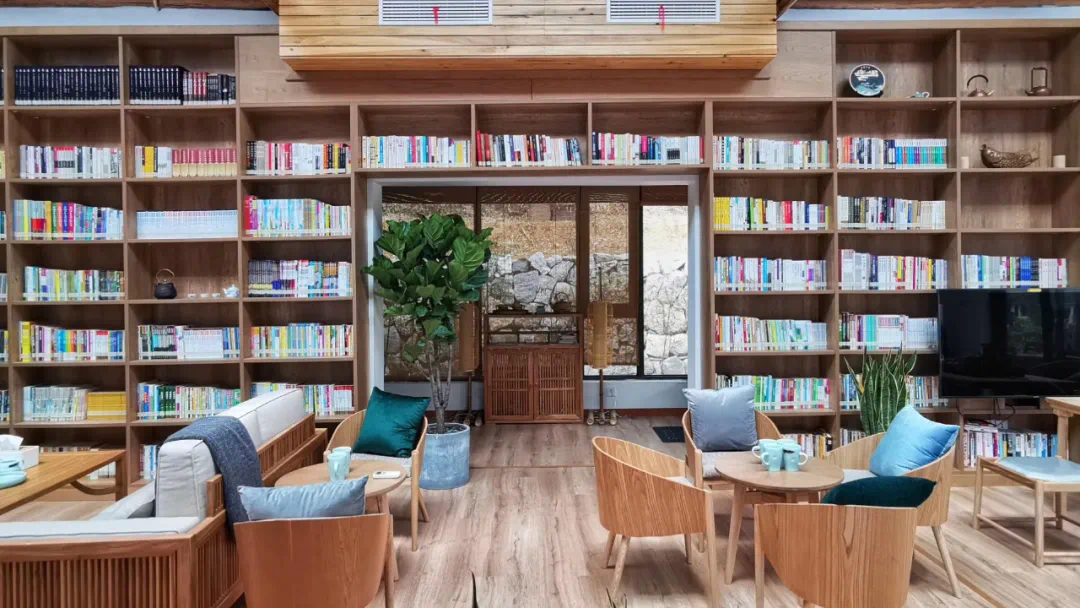 下姜村的“杭州书房”通过租用两幢下姜村民房改建而成,依山傍水,约200平米白墙黛瓦的杭派民居里,全套实木家具早已架设完毕,整排贴地大窗户尽透明亮,幕墙书架上堆满藏书,暖光温馨,天气晴好,还能坐在露天平台上边喝茶,边读书,享受最宁静惬意的午后时光。