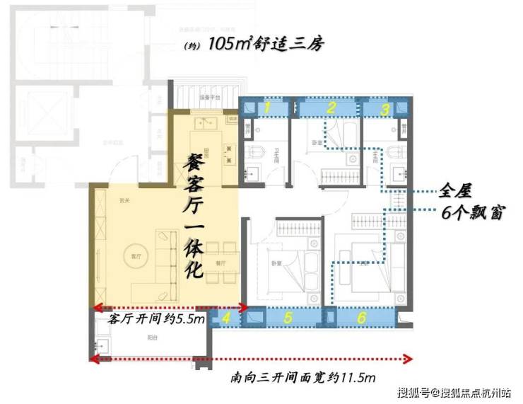 优越的窗墙比,可以最大限度将优美的景观纳入眼帘;南向三开间面宽更是达到了约11.5米,可以说市场同户型面积段产品很难做到这样极致化;功能房间以舒适度为导向服务生活,尺度均做到了当下主流产品水平之上;并且全屋附赠6处飘窗,高附加值令人心动。