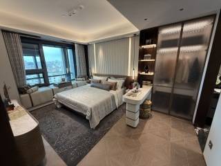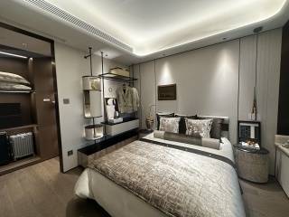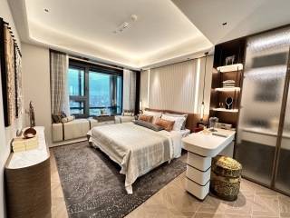 四开间朝南,约 6.9 米宽景大横厅,超大采光面,270° 观景视野,可俯瞰公园或江景,奢阔大气。独立入户玄关,私享电梯厅,类一梯一户设计,彰显高端圈层身份。餐客厅一体化设计,连接南向宽景阳台,空间通透开阔,社交属性强。主卧顶级套房,带独立卫浴(双台盆设计)、步入式衣帽间、观景飘窗与独立卫生间,私密性与舒适度兼具。三个次卧空间宽敞,南次卧带储藏间,北次卧 270° 飘窗,功能灵活多变,可满足高端改善家庭对空间的极致追求。