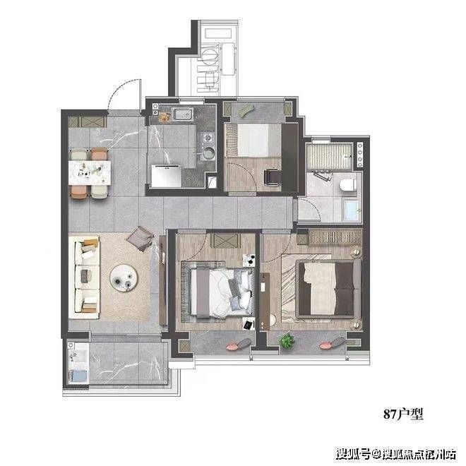 建面约99㎡的三房设计,在空间上使用功能更加多样化, 一站式解决了家庭生活的所有功能 ,优化居家动线,大大提升空间的居住体验。