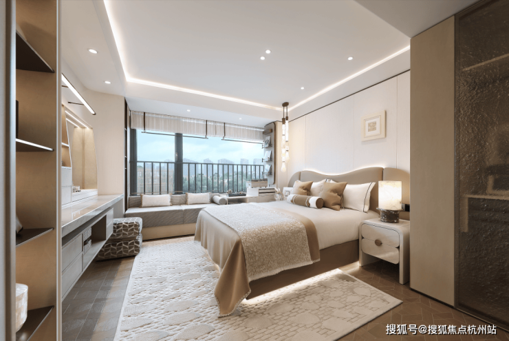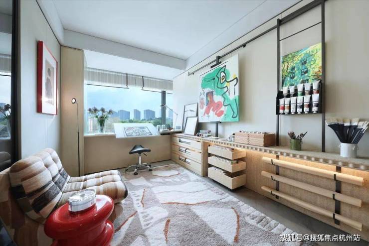 公建化的立面,四面铝板搭配大面积玻璃,阳台统一封包,底层的浅色天然石材还被打磨出弧线,脱去厚重外壳,轻盈洒脱。项目西侧直线约800米就是钱塘江,春来晴翠也在园区里编织了一幅山水画卷。
