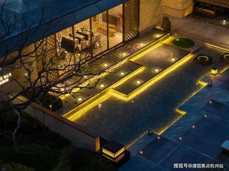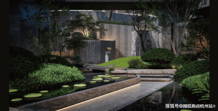 入户花园采用对称式花池和景墙设计,高定发光格栅花池,搭配丰富植被植物,随景入户,仪式感归家,潺潺水流平静心灵。