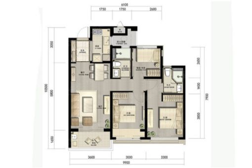 3室2厅2卫的设计,极大提高了空间的利用率。另外还做到了三开间朝南,面宽达9.9米,采光性能好。 客厅朝南带阳台,采光好,光线充足。