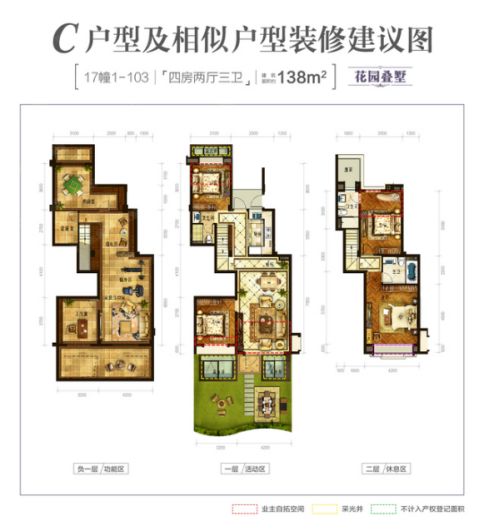 如下图的户型图,负一层可以作为工作、休闲、聊天的功能区;而一层有花园、餐客厅,可以作为家庭主要活动区,同时一楼也有一个房间设计,可以作为家里老人居住的房间;二层则是主要卧室区,三个房间的设计保证了家庭成员的居住空间。