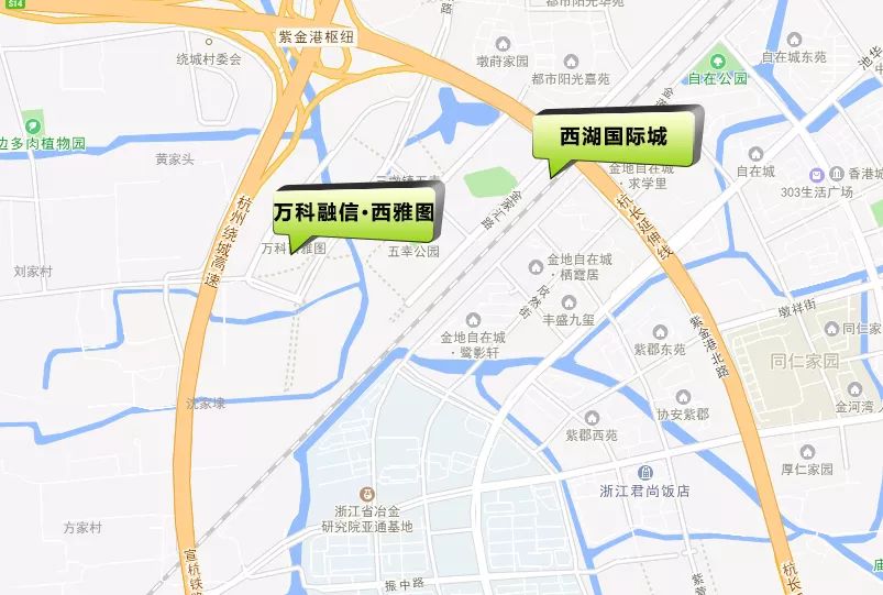 相比较而言,西湖国际城比万科西雅图离高架更远一点,高架的影响也就更弱一些。但是离地铁站还是西湖国际城更近一些。