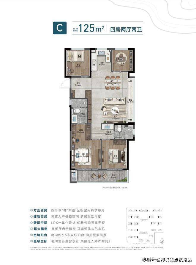 中建·潮阅尚境, 建面约125方四叶草边套,四室两厅两卫的格局,让改善生活大有可享。入口的玄关 ,幻化归家的礼序,让生活竟然有序; 近31方的LDK一体化大通厅 ,装载生活的万千想象,每次派对组局,尽显主人排场; 星级主卧套房与南向次卧自带大飘窗,接连约6.6米双联阳台 ,日常起居,阳光倾泻而入,谱写心动的日常。