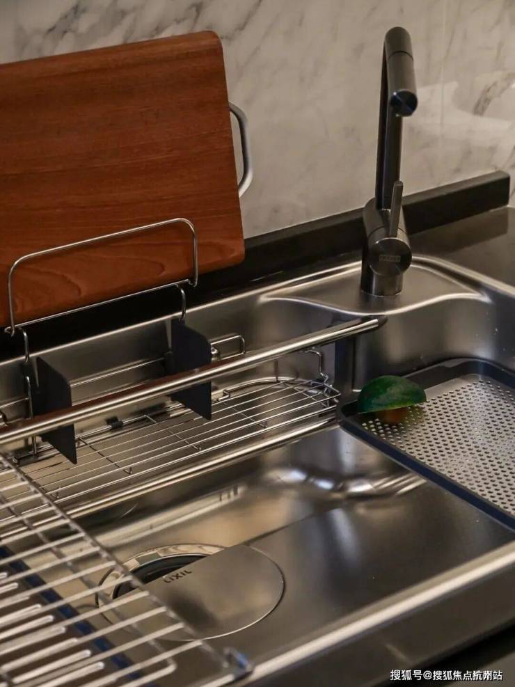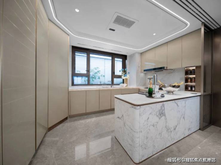 甚至,厨房的面宽也达到了约4.55米,超过主卧的面宽。独特的G型设计,串联起中西厨,岛台还贴心的做了加高处理。