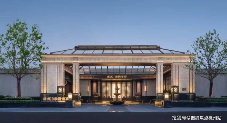 项目的门楼采用了上海海鸥丽晶酒店同款 巴西金石材 ,细节打造凹缝、线脚的多重叠级,形成立面层次丰富的明暗对比。