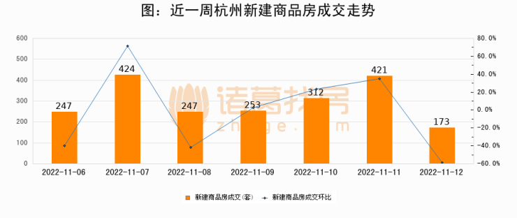 根据杭州市住房保障和房产管理局数据显示,2022年11月12日杭州新建商品房成交173套,较昨日减少248套,环比下降58.9%