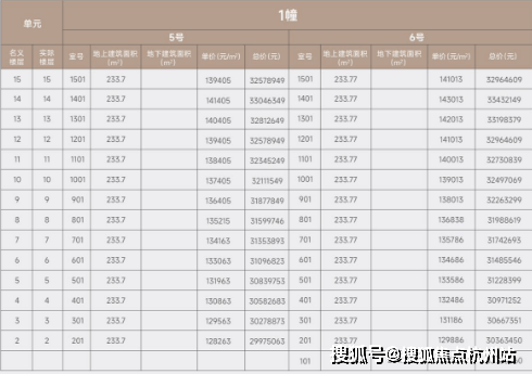 项目少量建面约235m²4房户型在售,整盘均价13万/m²,在售房源均价12.8万/m²,总价2997-3598万,一房一价表如下: