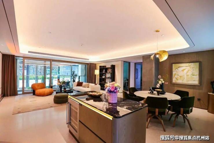 客厅采用艺术漆+实木贴面做装饰,天然石材做背景墙,地面采用岩板铺设,奢贵之感简直溢出屏幕!