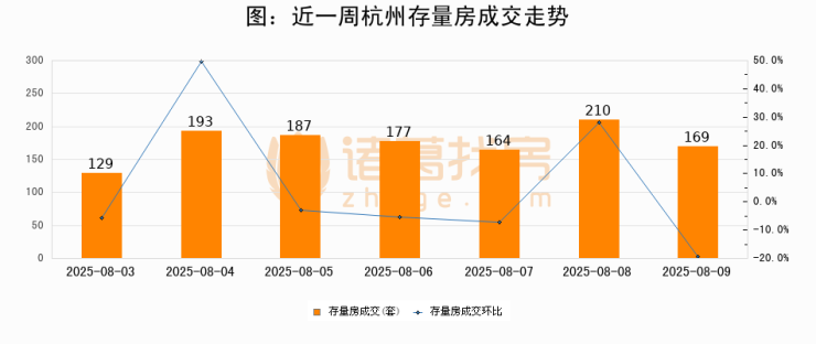 从存量房来看,2025年08月09日杭州存量房单日成交169套,比昨日减少41套,环比下降19.5%。从近一周存量房成交来看,杭州存量房日均成交套数为175套,08月09日单日成交169套,低于近一周平均水平3.4%。