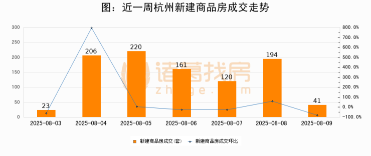 根据杭州市住房保障和房产管理局数据显示,2025年08月09日杭州新建商品房成交41套,较昨日减少153套,环比下降78.9%。近一周杭州新建商品房日均成交138套。08月09日单日成交41套,低于近一周平均水平70.3%。