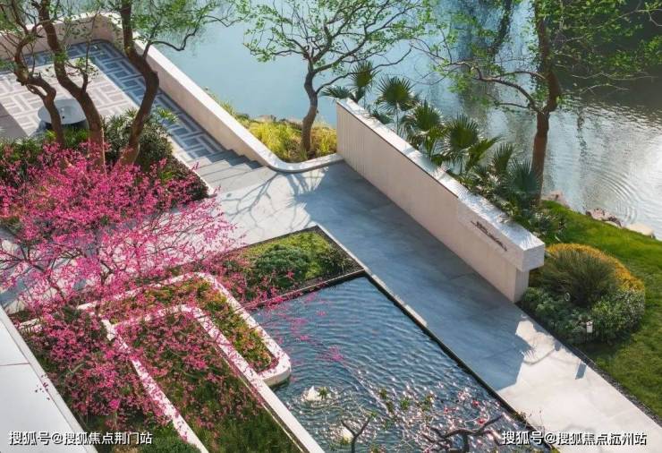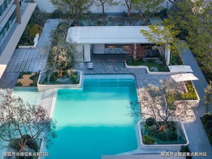 很多楼盘水池铺的都是瓷砖马赛克,但它却用上了意大利卡拉卡白大理石,将池水衬出梦幻的蒂芙尼蓝。池边摇曳着油橄榄树、造型紫薇,高级感丝毫不逊现在那几个网红豪宅。