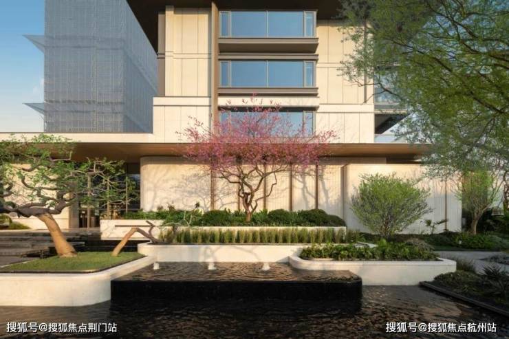 它的大门用上了贝金米黄和孔雀开屏奢石,搭配超尺的环岛落客区、对立两侧的铁冬青,一眼就贵气逼人。