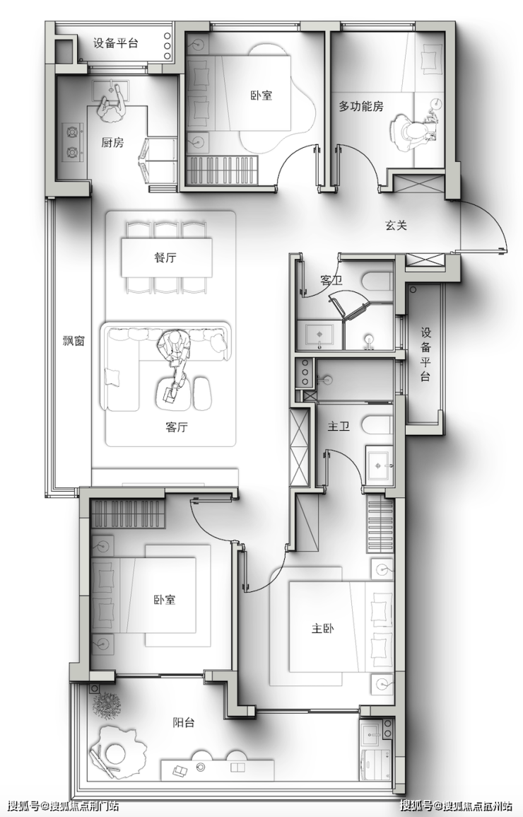 不仅做到了大边厅+四房,而且还带一个进深约2米的转角阳台(很多豪宅阳台进深也不过1.8米),就像自带一座空中花园。