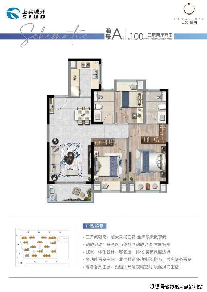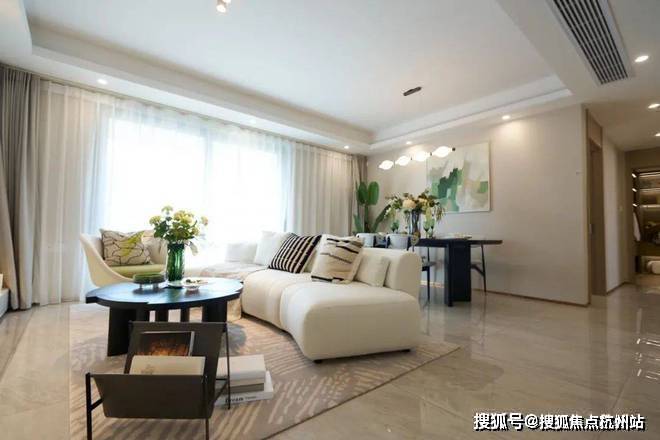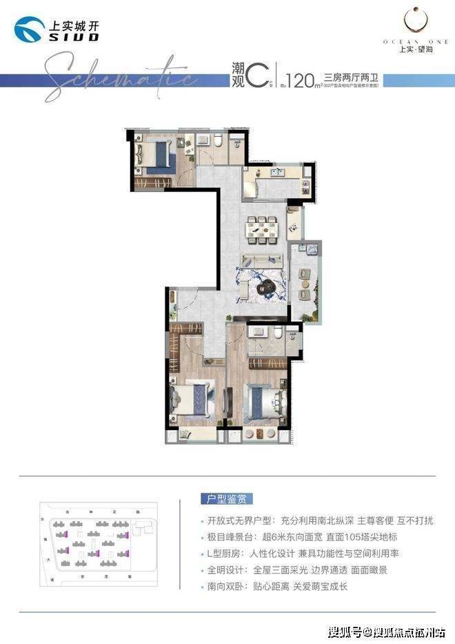 户型方面,上实望海打造建面约120 m²中芯极享家,南向双面全景横厅设计,约5.5米IMAX级横厅、U型厨房的动线布局、主卧套房设计