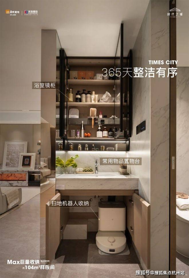 主卫更是做了通长镜柜和置物台,两大镜柜+一个美妆冰箱,内置牙刷清洁器、插座、化妆工具插槽等分区。