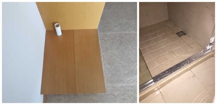 预留的洗衣机隔板也不是防水的,卫生间内淋浴间的围挡防水也没做好,齐女士说刚才试了一下水会漏到外面。