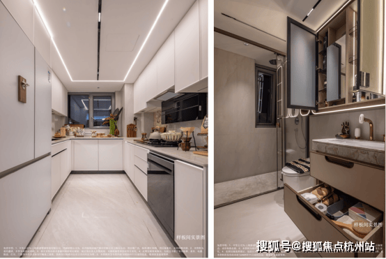 设计深度贴合日常需求,让精装不止于“豪”更在于“舒”。厨房采用 人体工学高低台 布局,烹饪区低于水槽区,契合手臂自然下垂的舒适角度,让烹饪动作行云流水,大幅减轻家务疲劳。更精准捕捉女性需求,卫生间专门配备 科勒美妆龙头、美 妆镜柜、美妆冰箱,搭配“顶+面双补光照明” ,将“女本位”关怀落到细节,这般细致在同类项目中实属难得。