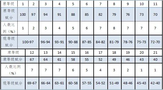 注意:从2022年1月选考起,选考科目等级赋分的分差由3分改为1分。在原21等级基础上划分为20个赋分区间,将原第1(1%,100分)、第2(2%,97分)两个等级合并为一个赋分区间,其余不变。各对应区间内按等比例转换,四舍五入将卷面得分转换为等级分。