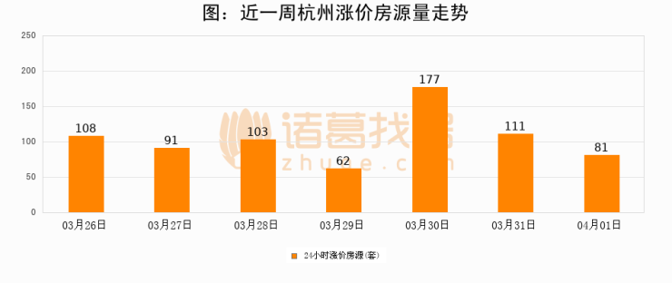 根据诸葛找房数据显示,杭州24小时涨价房源量为81套,较03月31日减少30套,环比下降27%。与此同时,涨价房源占比小幅回落,对于购房者来说是一个入市窗口期,购房者可抓住时机入市。