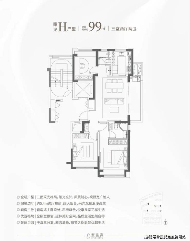 3、楼王H户型:270°环幕江景,绝佳视野和尺度