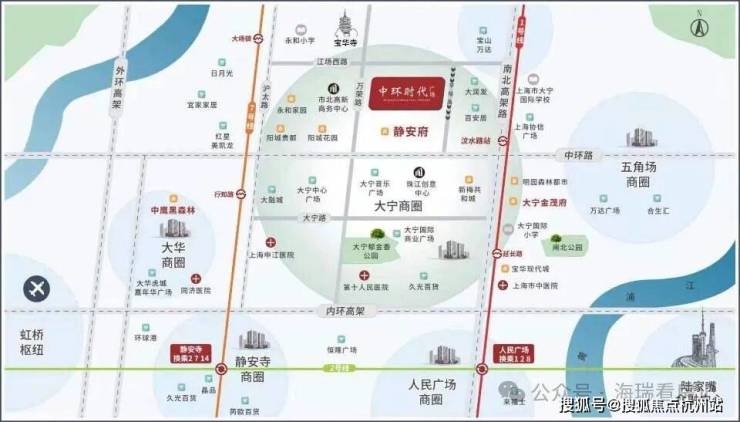 交通地铁:毗邻地铁 1 号线和 7 号线,地铁 1 号线汶水路站距离项目约 700 米,乘坐 1 号线 7 站可直达人民广场,此外还有中环高架、南北高架和 36 条城市公交线路,出行便利