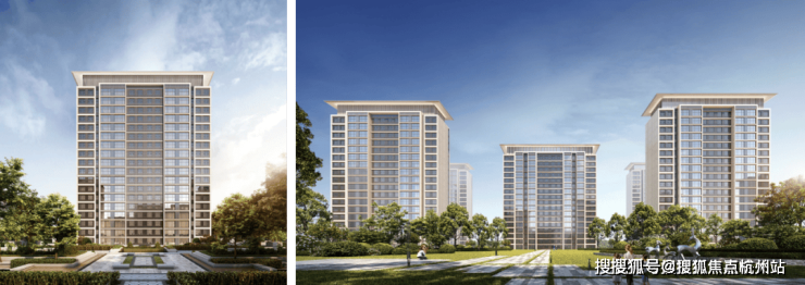 外立面采用经典时尚现代主义风格:通过温和的色彩搭配、简练的横向线条、黄金比例的立面比例、极简抽象的建筑符号、建筑顶部的飘板,呈现一个现代风格和艺术气质结合的高品质社区。