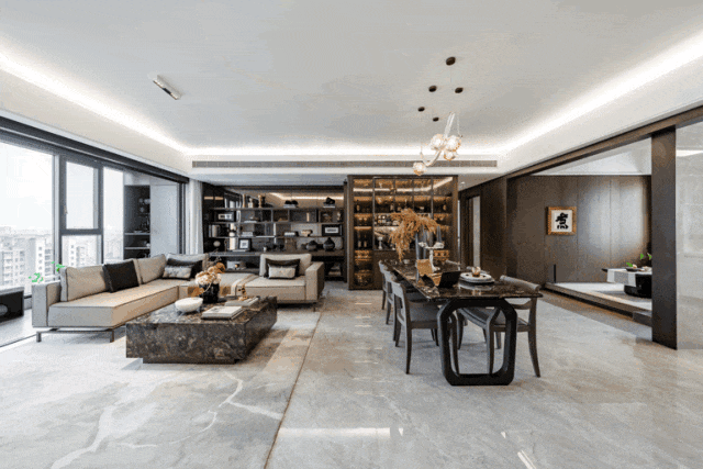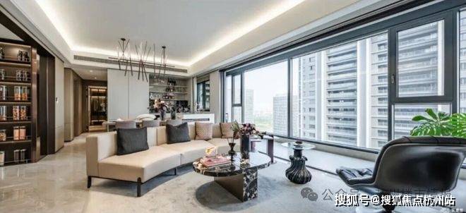 建筑采用公建化立面,以大面积的玻璃幕墙、深灰色金属线条和立体化金属格栅,复刻现代都会美学。不仅历久弥新,更具极佳的隔热隔音效果。